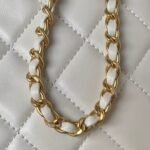 This CC shoulder bag is made of white lambskin with antique gold hardware, tonal stitching, square structure, large antique gold CC clasp that folds over the front top of the bag.