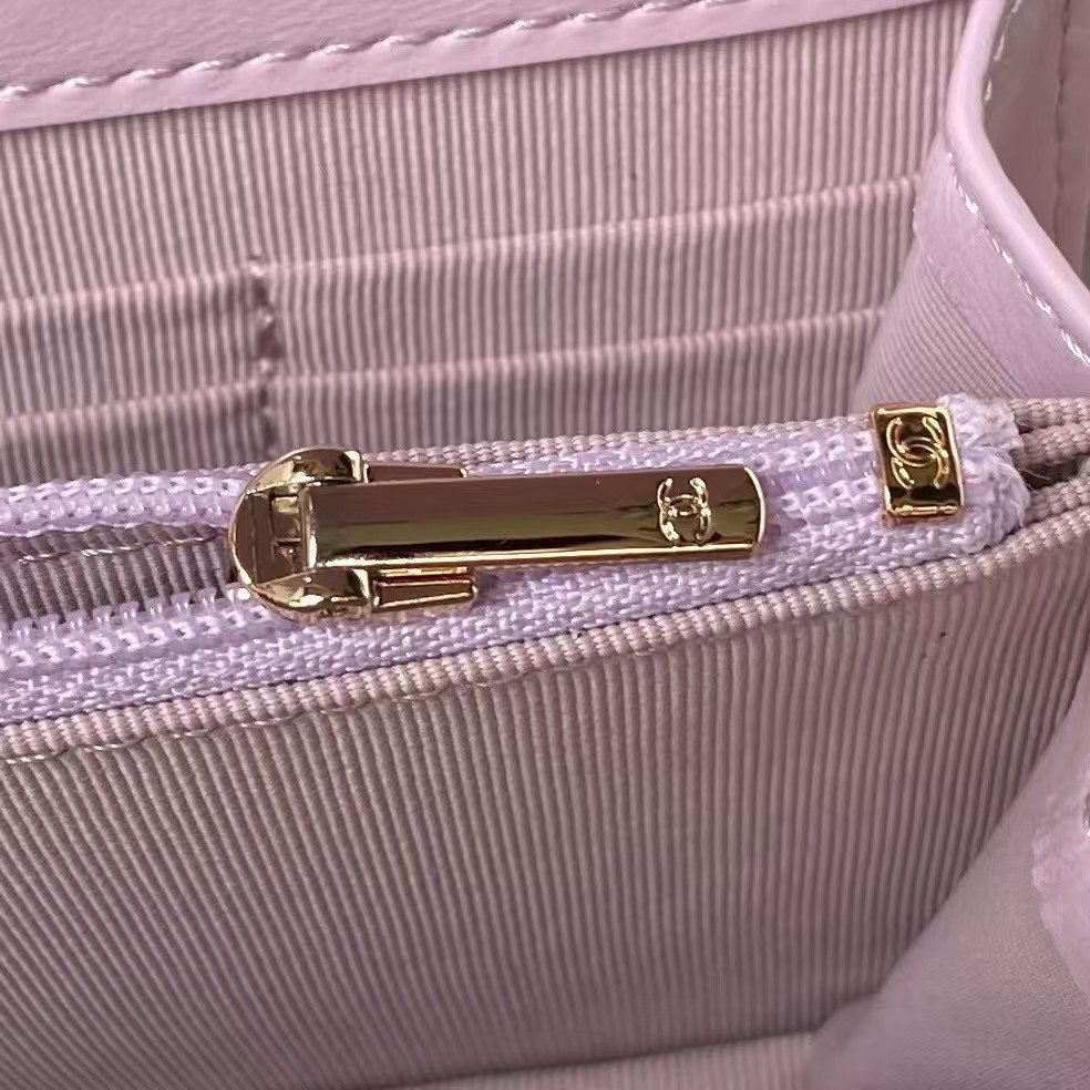 New Chanel 24p Top Handle WOC Pearl Handle Gold Embossed Double C Button Shiny Crinkled Lambskin Purple