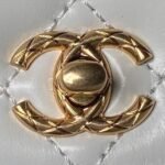 This small rectangular flap bag features a metal top handle and is made from white shiny calfskin with gold hardware, front flap with CC turnlock closure, half-moon back pocket, top handle and single interwoven antique gold chain link and white leather shoulder/crossbody strap.