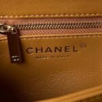 The interior is lined with caramel leather and features two compartments and a zip pocket with a Chanel zipper pull.