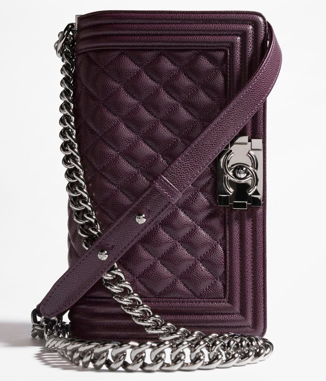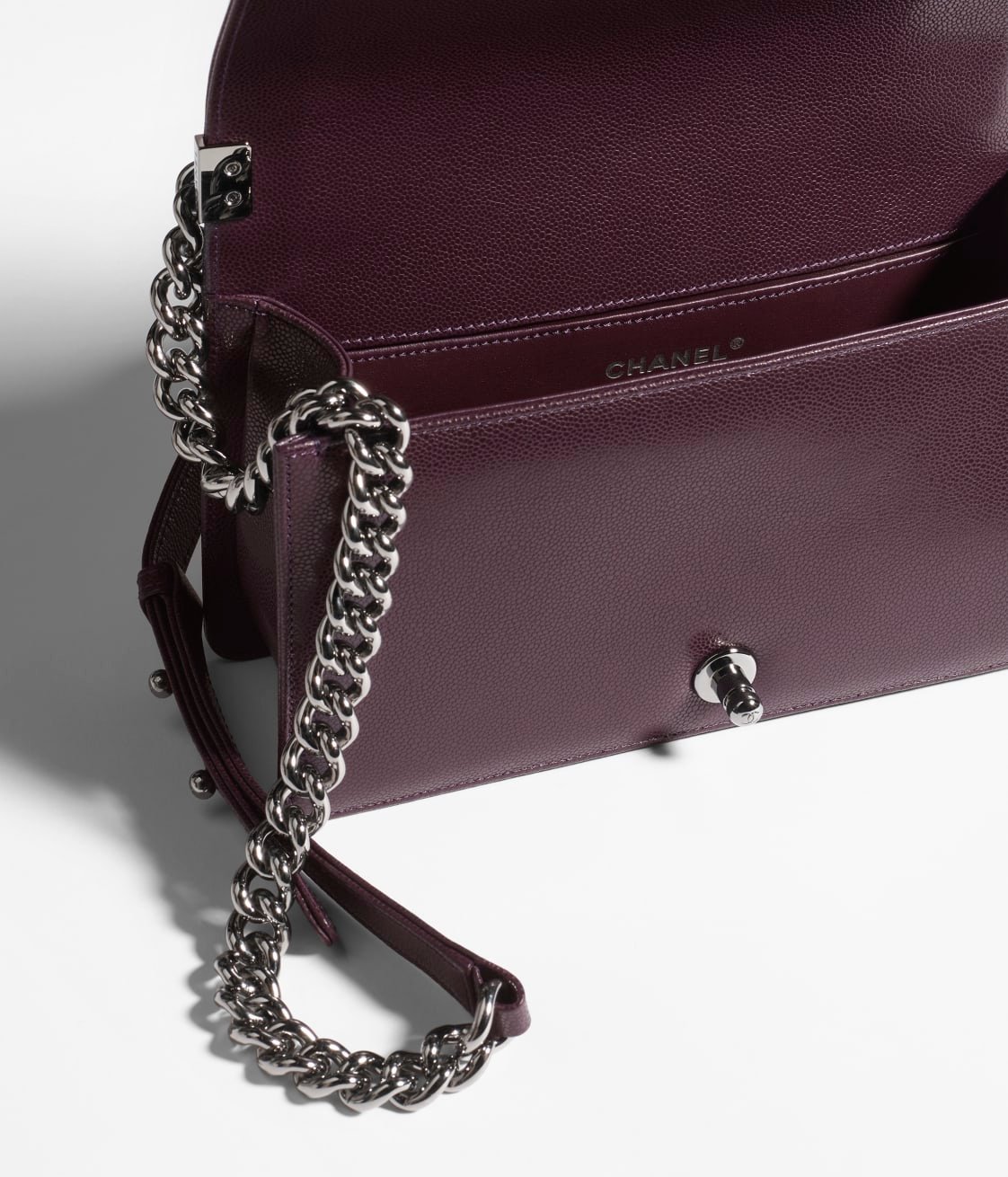 This Chanel Medium Boy Bag is crafted in burgundy lambskin with ruthenium hardware and features a full front flap, Le Boy CC snaps and ruthenium-toned chain links, and a burgundy leather padded shoulder/crossbody strap.