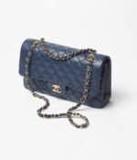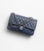 This flap bag is made of blue lambskin with gold-tone hardware, front flap with signature CC turnlock closure, half-moon back pocket, adjustable gold-tone interwoven chain link and blue leather shoulder strap.