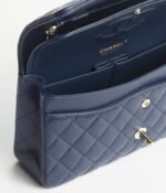 The interior is lined with blue leather and features a “love letter” zippered compartment under the first flap, an “outside” open pocket under the second flap, and an interior compartment with two open pockets and a “lipstick” compartment in the middle.