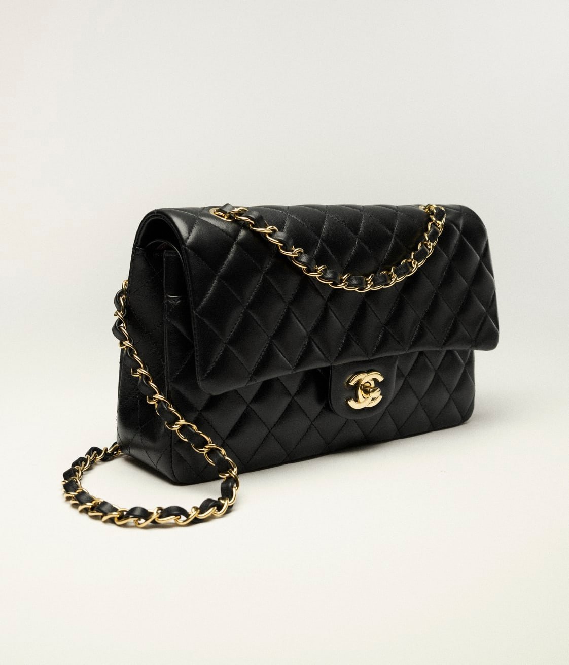 This flap bag is crafted in black lambskin and light gold hardware, with the signature CC turnlock closure on the front flap, a half-moon pocket on the back, and a single interwoven black leather and light gold chain link shoulder/crossbody strap.