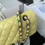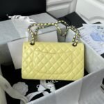 This medium classic double flap bag is crafted in yellow lambskin leather with gradient metal hardware, featuring the signature gradient metal CC turnlock closure on the front flap, half-moon back pocket, adjustable interwoven gradient chain and black leather shoulder strap.