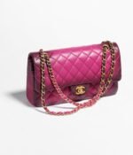 The interior is lined with fuchsia leather and features a zip pocket with logo zipper on the back wall and an open pocket on the back wall below the zip pocket.