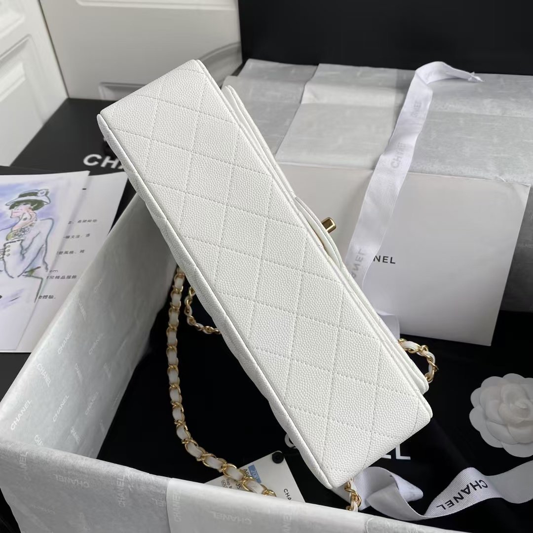 This medium classic double flap bag is crafted in white caviar leather with light gold hardware, featuring the signature CC turnlock closure on the front flap, half-moon back pocket, adjustable interwoven light gold chain and white leather shoulder strap.