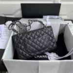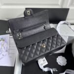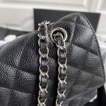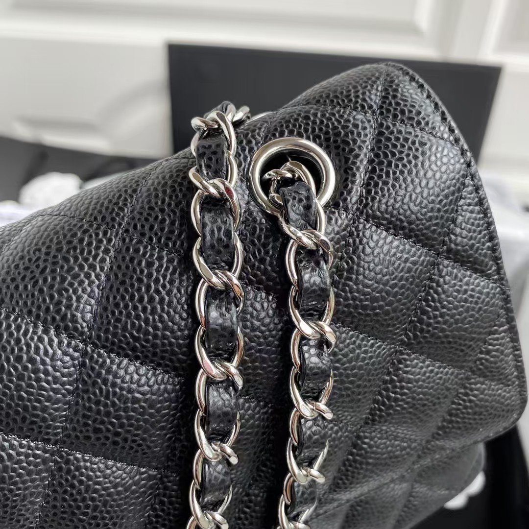 This medium classic double flap bag is made of black caviar leather with silver hardware, signature CC turnlock closure on the front flap, half-moon back pocket, adjustable interwoven silver chain and black leather shoulder strap.