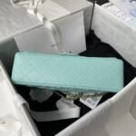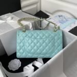 This Medium Classic Double Flap Bag in Light Blue Caviar Leather with Light Gold Hardware, front flap with signature CC turnlock closure, half-moon back pocket, adjustable interwoven light gold chain and light blue leather shoulder strap.