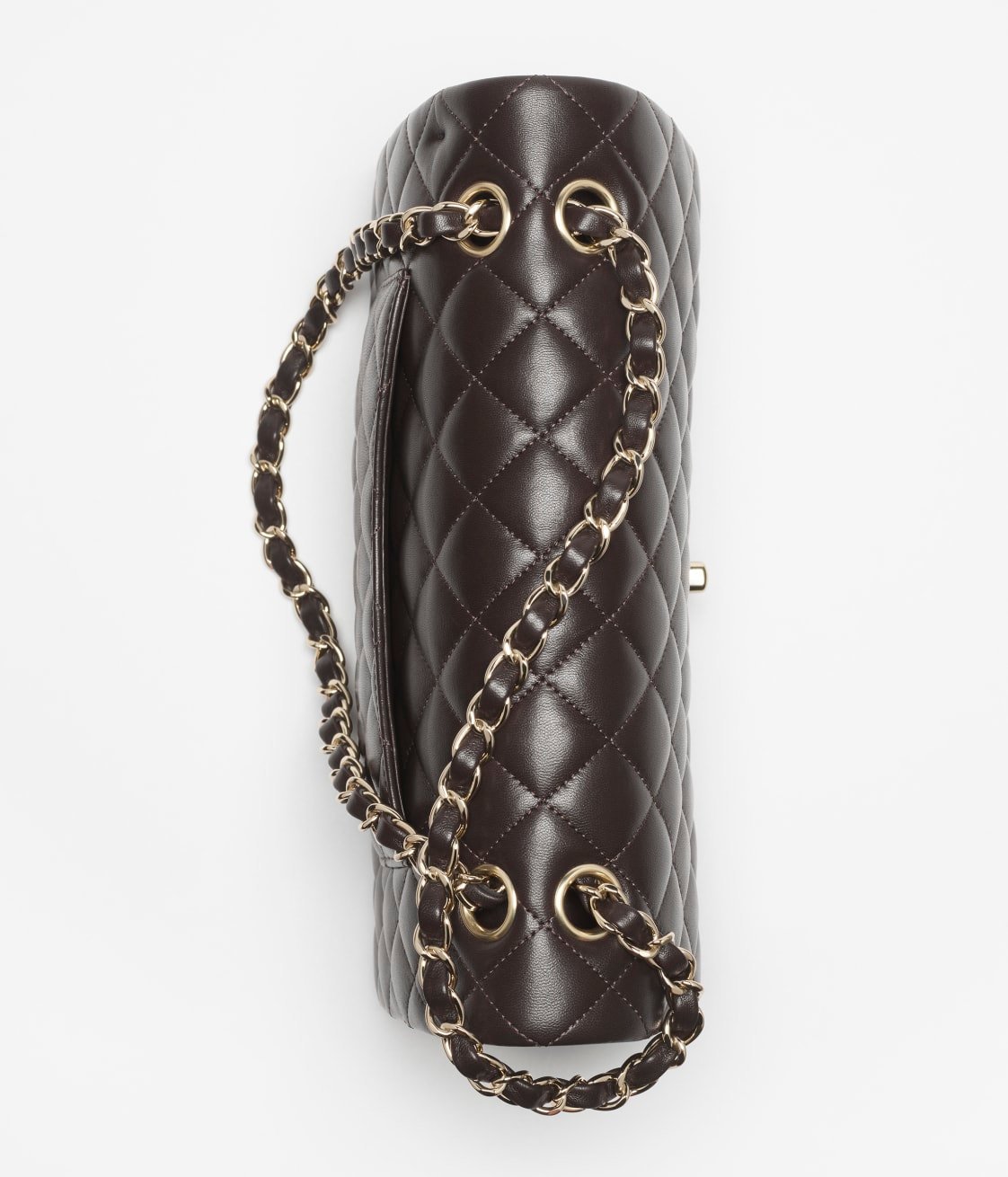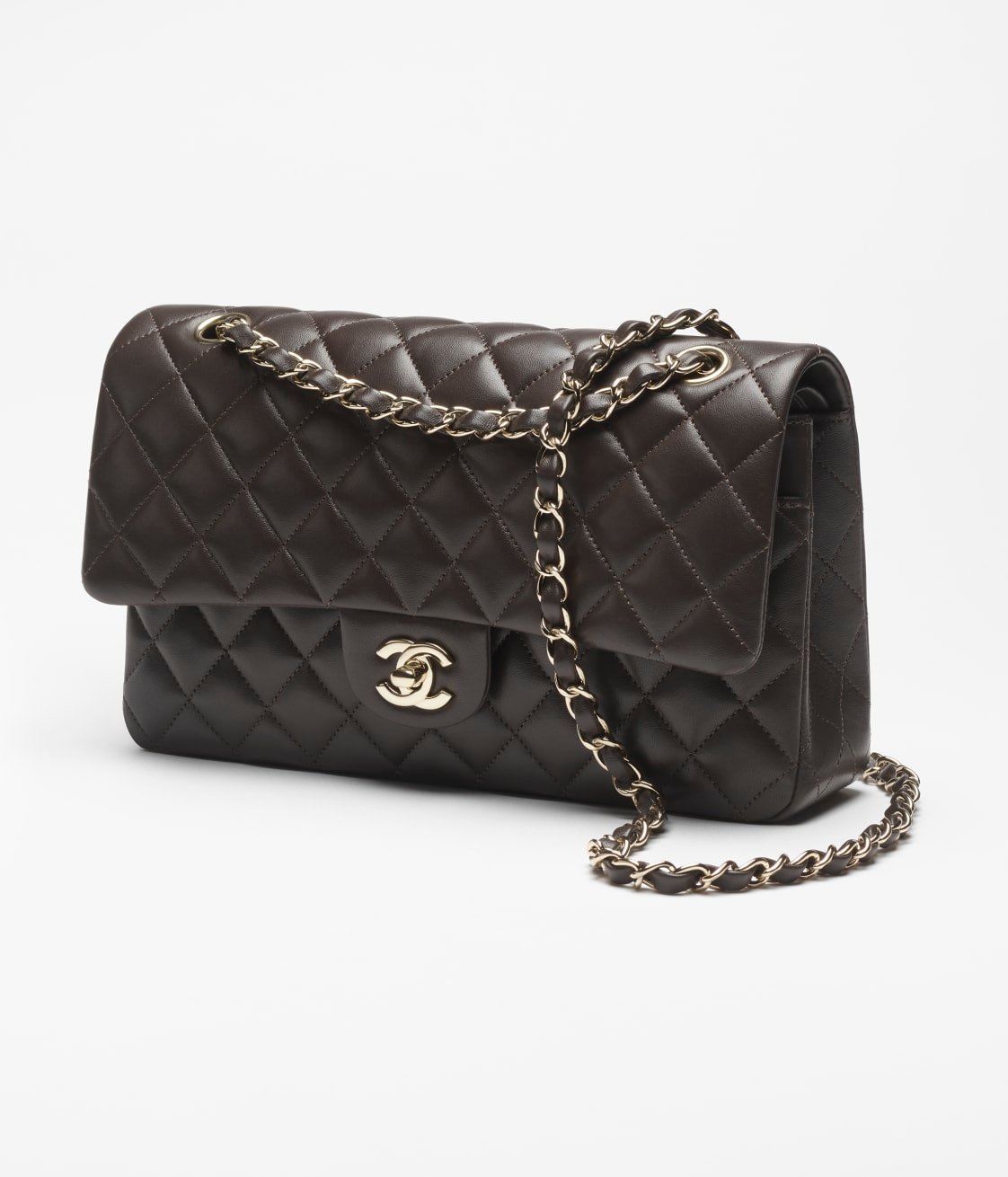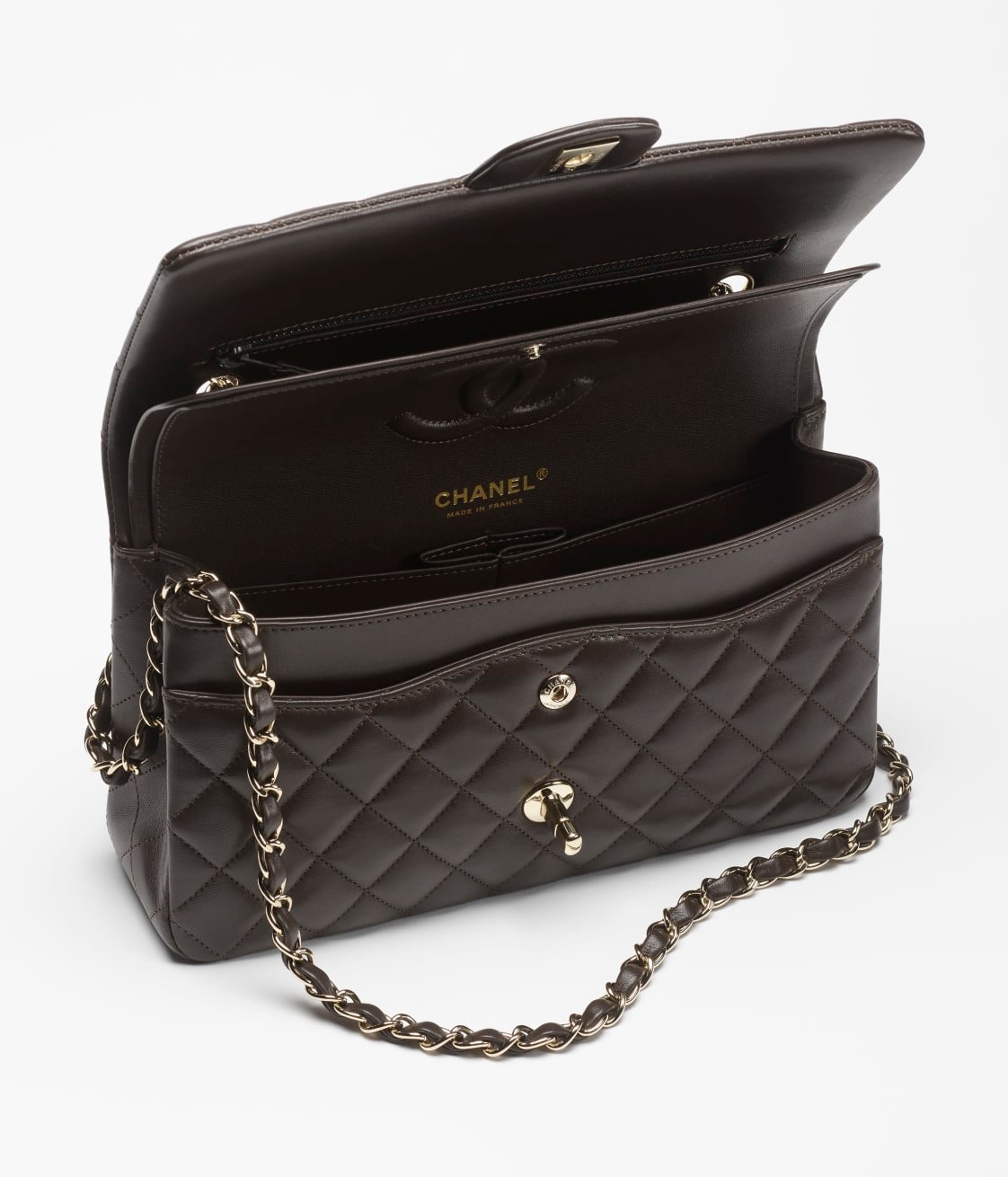 This flap bag is made of dark brown lambskin with gold hardware, front flap with signature CC turnlock closure, half-moon back pocket, adjustable gold interwoven chain link and dark brown leather shoulder strap.
