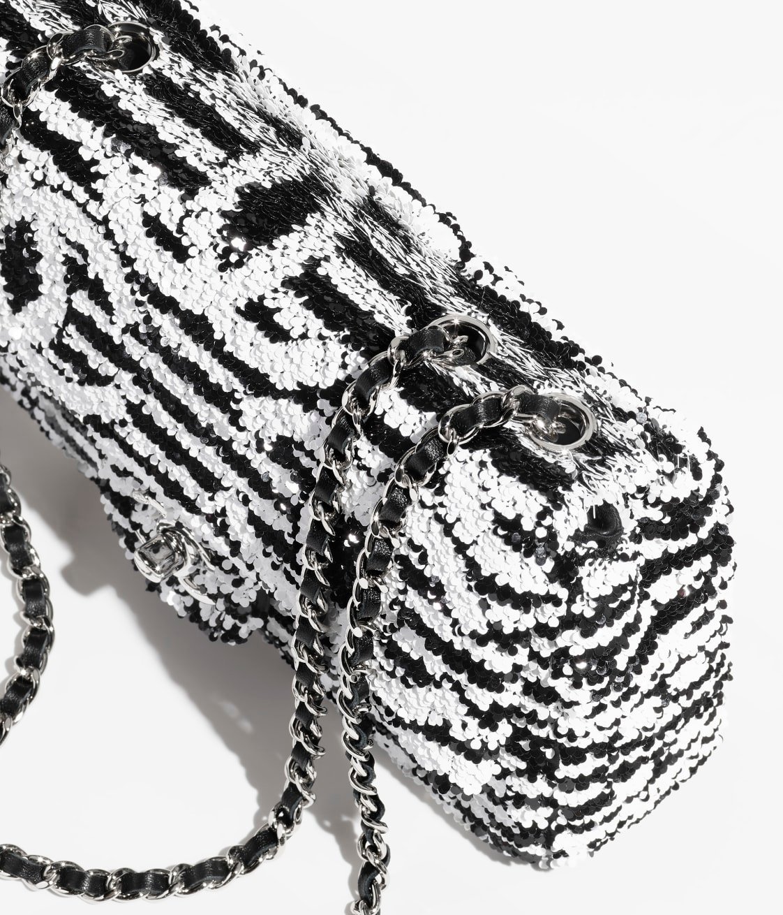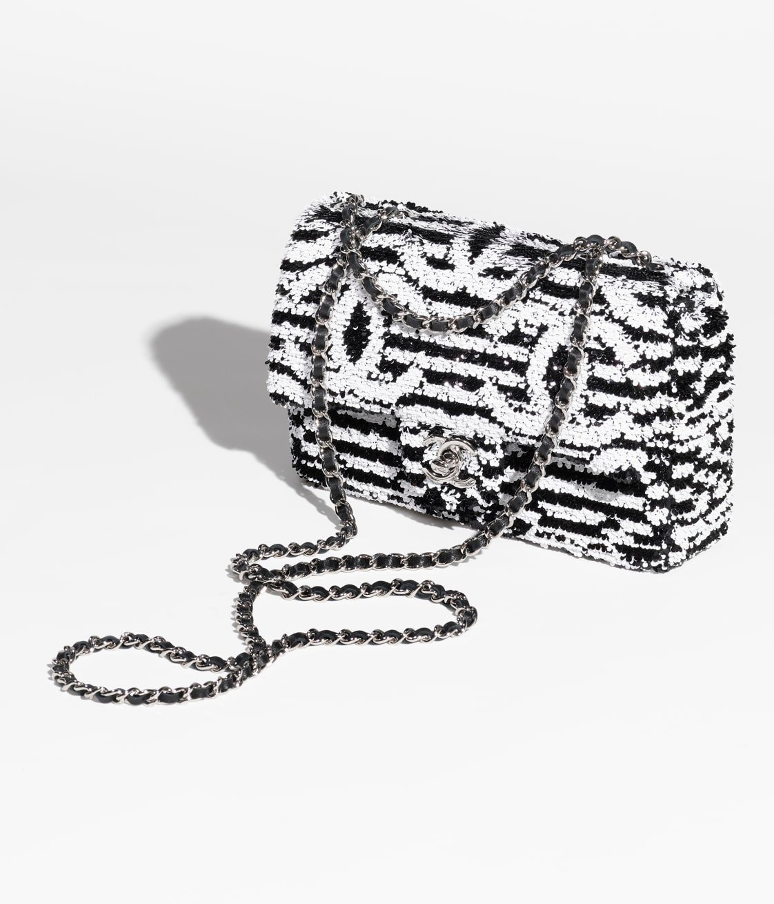 This vintage micro flap bag is crafted in black and white sequins, ribbed satin and leather with silver-tone hardware, tonal stitching, CC turnlock closure, interwoven silver-tone chain links and a black leather shoulder strap.