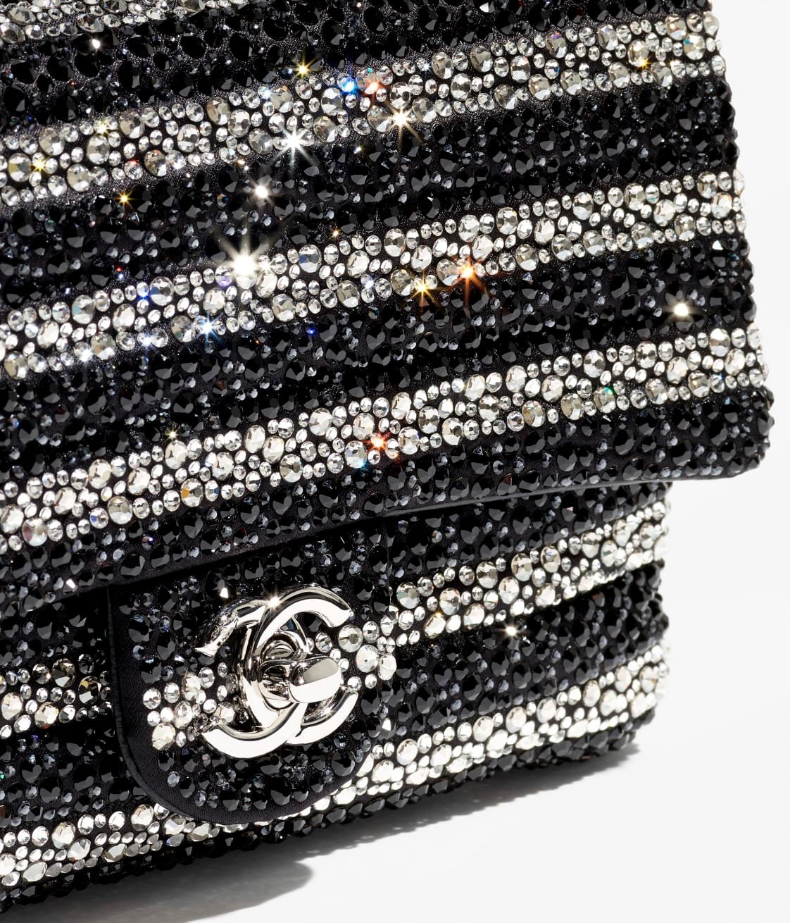 This flap bag is embellished with black and white crystals and features silver-tone hardware. It has a front flap with the signature CC turnlock closure, and an interwoven black leather and silver-tone chain link shoulder/crossbody strap.