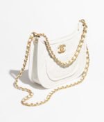 This Chanel HOBO bag is made of white calfskin leather with antique gold hardware, tone-on-tone stitching, front half-moon pocket with CC turnlock closure, antique gold chain and leather shoulder/crossbody strap.