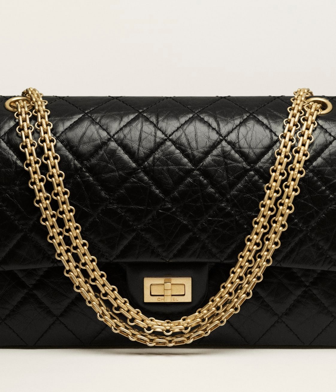 This large Reissue 2.55 single flap bag is crafted from distressed black calfskin with antique gold hardware, a front flap with a Mademoiselle turnlock closure, half-moon back pockets and interwoven gold-tone links.