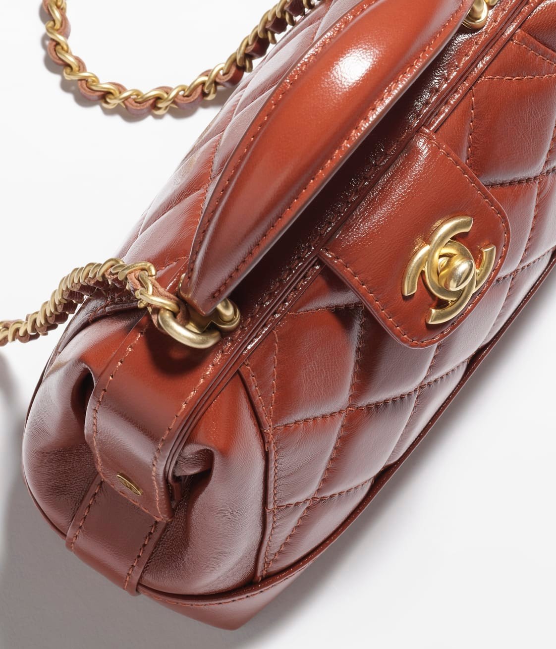 This Chanel Mini Top Handle Flap Bag is crafted in brown shiny lambskin with light gold hardware, the trapezoidal design features signature diamond quilting, signature interlocking CC clasp, top handles and a long light gold and brown leather chain.