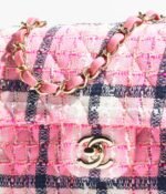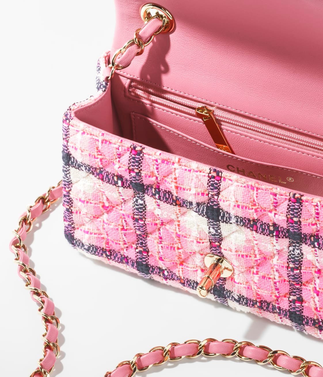 This Chanel Mini Classic Rectangular Flap Bag is in pink, white and blacktweed boucle with light gold hardware and has a front flap with signature CC turnlock closure, a half moon rear pocket, and an interwoven light gold chain link and pink leather shoulder/crossbody strap.