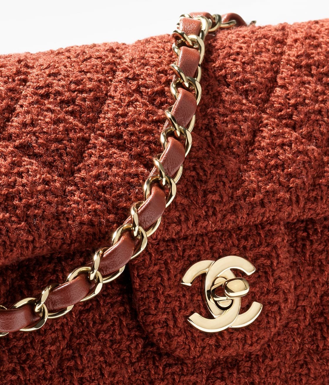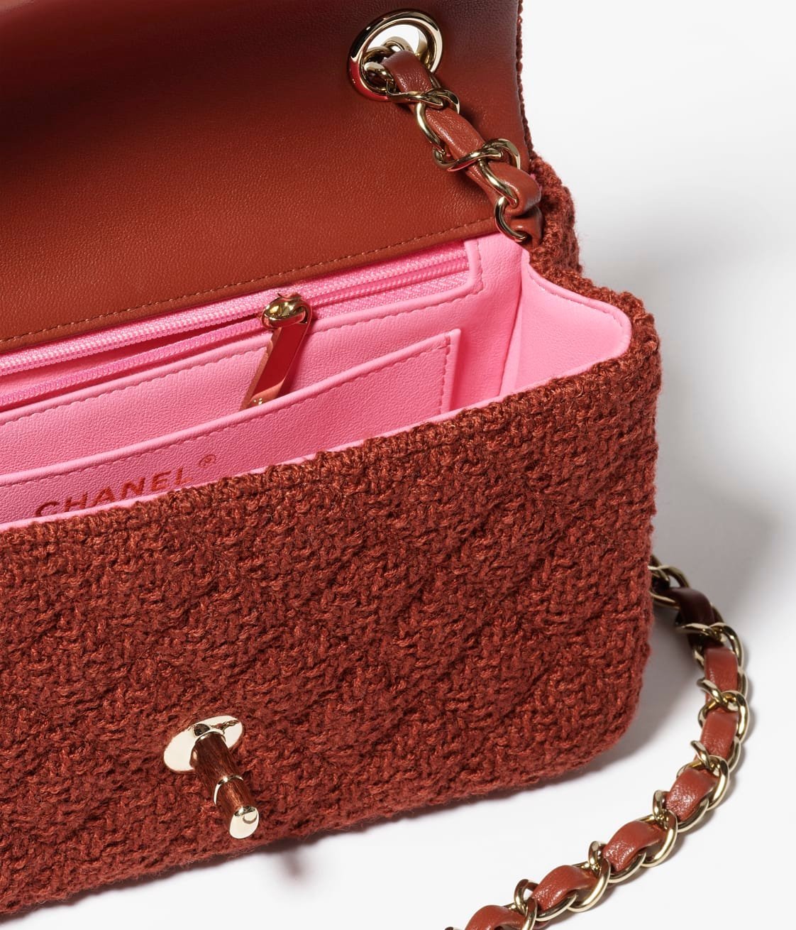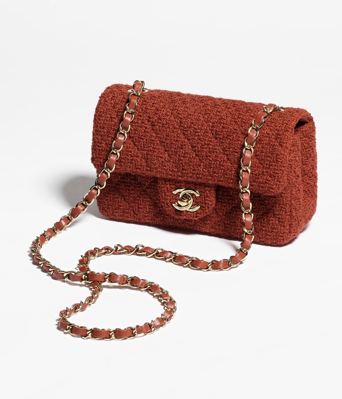 This Chanel Mini rectangular flap bag in dark brown tweed features light gold hardware, front flap with CC turnlock closure, half-moon back pockets, interwoven light gold chain links and brown shoulder/crossbody strap.