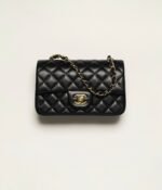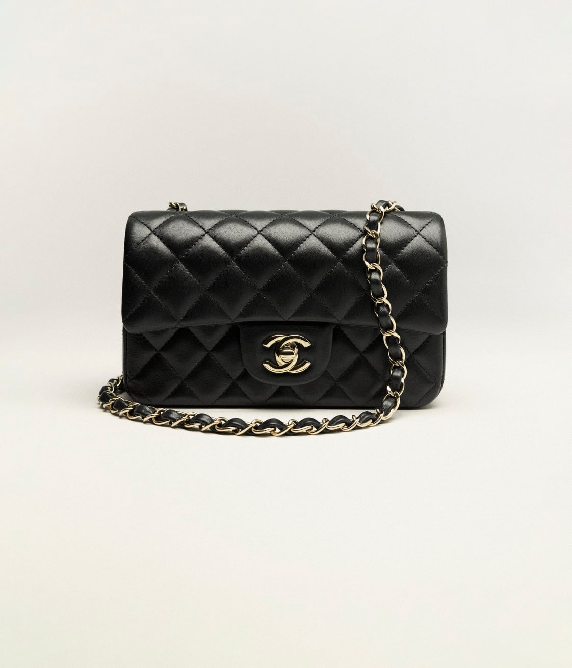 This flap bag is crafted in black lambskin and light gold hardware, with the signature CC turnlock closure on the front flap, a half-moon pocket on the back, and a single interwoven black leather and light gold chain link shoulder/crossbody strap.