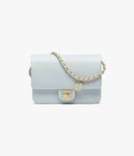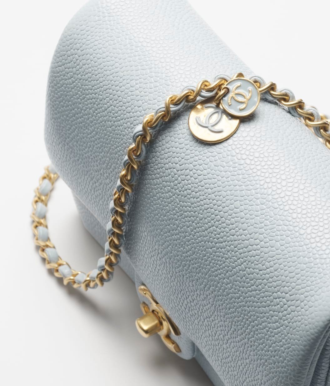 This Chanel Mini Flap Bag is crafted in light blue grained shiny calfskin with brushed gold hardware, front flap with CC turnlock closure, single interwoven brushed gold and black leather shoulder strap with two round CC coin charms.