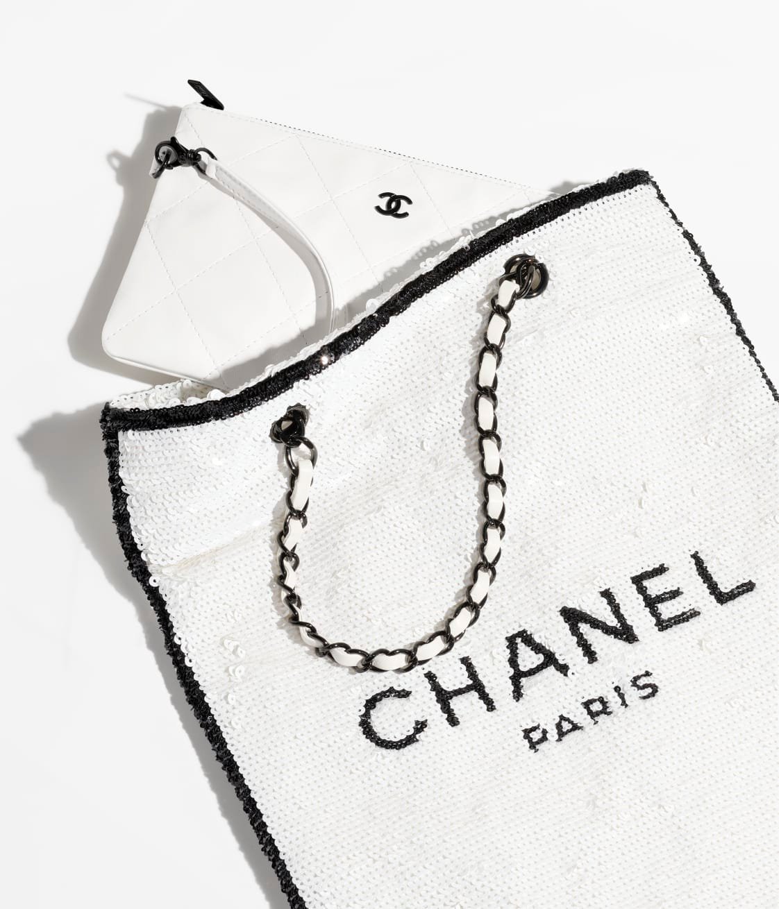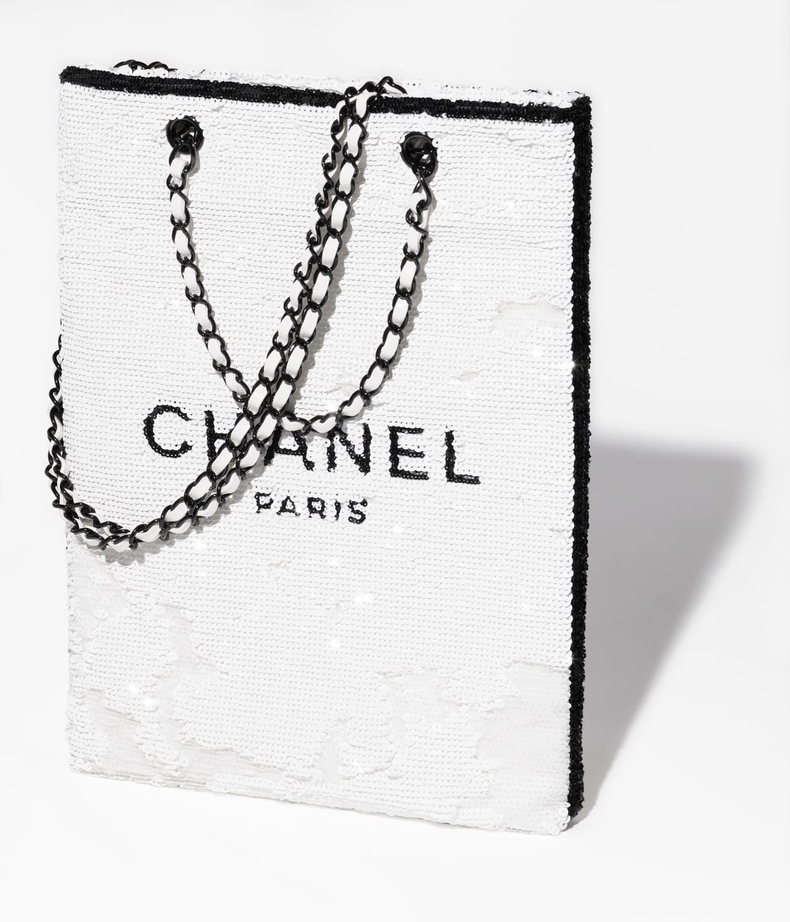 This shopping bag is made of white and black sequins, ribbed satin and leather, with black hardware, tonal stitching, a removable interior pocket, interwoven black metal chain links and a white leather shoulder strap.