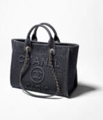 The handbag is made of distressed blue denim with light gold hardware, a large CC and Chanel logo printed on the front, a removable pouch, two rolled top handles, two interwoven light gold chain links and a blue denim shoulder strap.