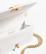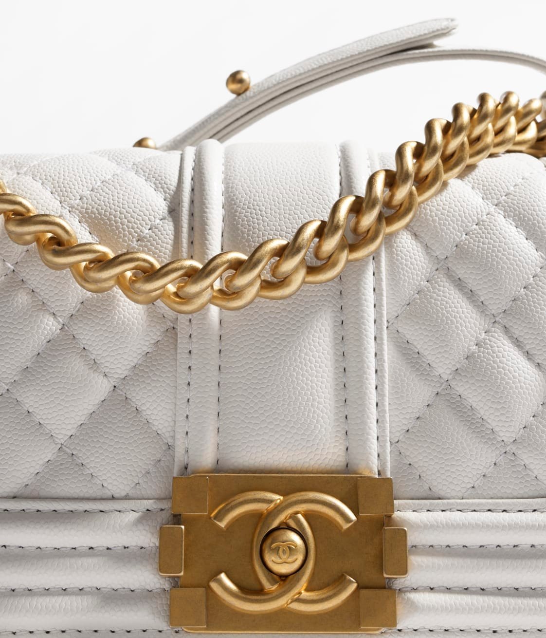 This Chanel Small Boy Bag is in white lambskin with gold-tone hardware, tone-on-tone stitching, front flap with Le Vintage Boy CC push closure, smooth leather trim, antique gold-tone chain link and white leather shoulder strap.