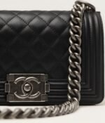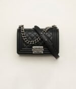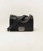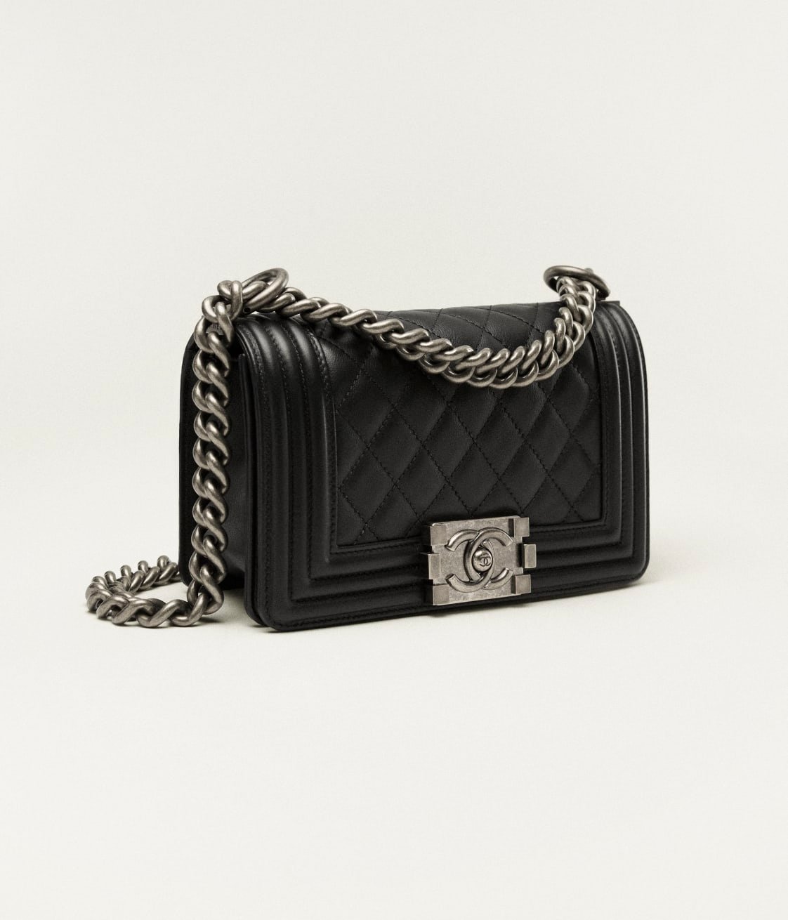 This Chanel Small Boy bag is crafted from black lambskin leather with ruthenium hardware, tone-on-tone stitching, front flap with Le Boy CC snaps, smooth leather trim, ruthenium chain and black leather shoulder strap.