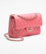 This small classic double flap bag is crafted in pink lambskin with gold hardware, featuring the signature CC turnlock closure on the front flap, a half-moon back pocket, and an adjustable gold interwoven chain link and pink leather shoulder strap.