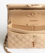 This small classic double flap bag is crafted in beige lambskin with gold hardware, front flap with signature CC turnlock closure, half-moon back pocket and adjustable gold interwoven chain link and beige leather shoulder strap.