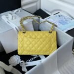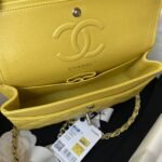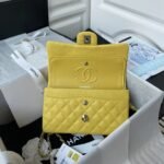 This small Classic Double Flap Bag in yellow caviar leather with silver hardware features a front flap with signature CC turnlock closure, half-moon back pocket, adjustable interwoven silver chain and yellow leather shoulder strap.