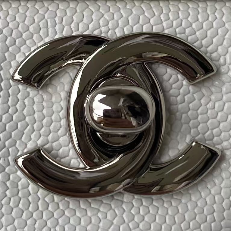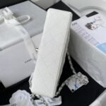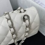 This small Classic Double Flap Bag is crafted in white caviar leather with silver hardware, front flap with signature CC turnlock closure, half-moon back pocket, adjustable interwoven silver chain and white leather shoulder strap.