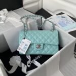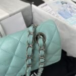 This small Classic Double Flap Bag in light blue caviar leather with silver hardware features a front flap with signature CC turnlock closure, half-moon back pocket, adjustable interwoven silver chain and light blue leather shoulder strap.