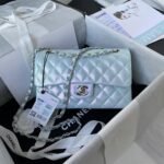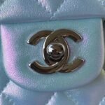 This small Classic Double Flap Bag is crafted in gradient blue lambskin with silver hardware, front flap with signature CC turnlock closure, half-moon back pocket, adjustable silver interwoven chain link and gradient light blue leather shoulder strap.