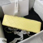 This yellow lambskin classic double flap bag with gradient metal hardware features the signature CC turnlock closure on the front flap, half-moon back pocket, adjustable gradient interwoven chain and yellow leather shoulder strap.