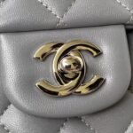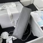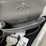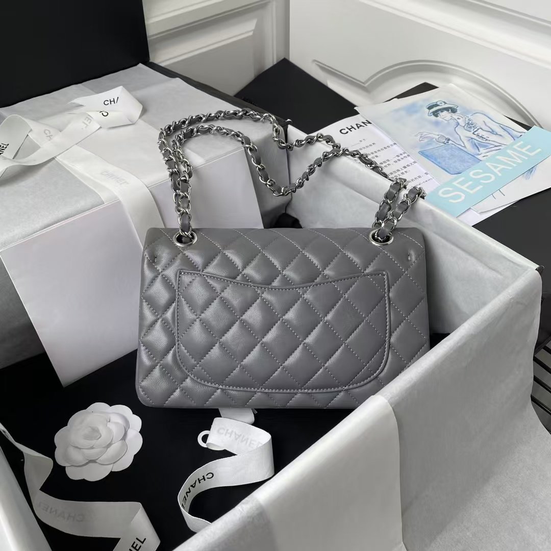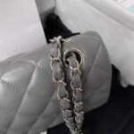 This small Classic Double Flap Bag is crafted in dark grey lambskin with silver hardware, front flap with signature CC turnlock closure, half-moon back pocket, adjustable silver interwoven chain link and dark grey leather shoulder strap.