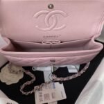 This small Classic Flap Bag is crafted in pink lambskin with silver hardware, front flap with CC turnlock closure, half-moon back pocket, adjustable interwoven silver chain and pink leather shoulder/crossbody strap.