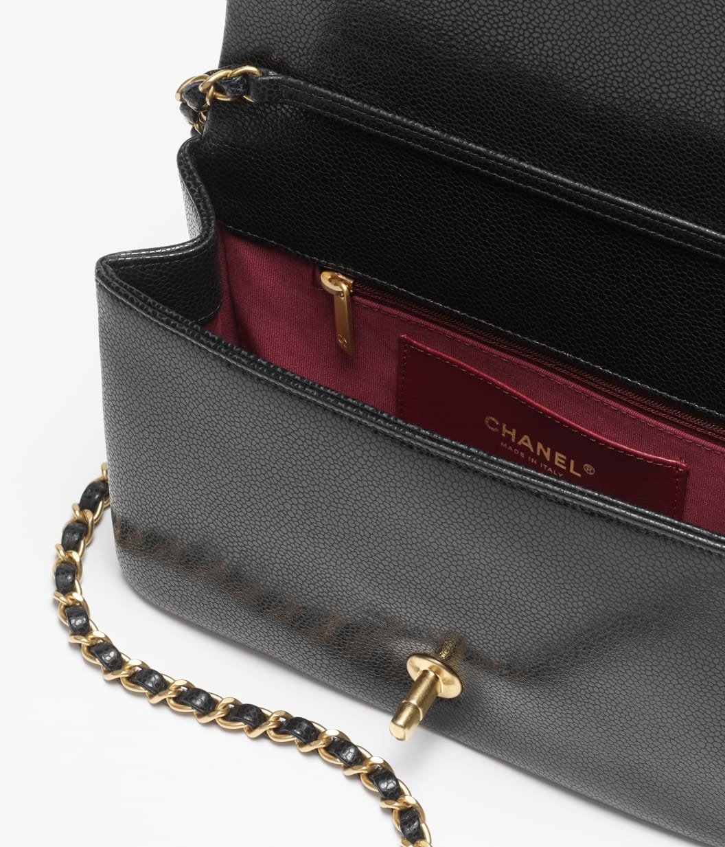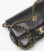This Chanel small flap bag is of black grained shiny calfskin leather with brushed gold hardware, featuring, a front flap CC turnlock closure and a single interwoven brushed gold and black leather shoulder strap with two round CC coin charms.