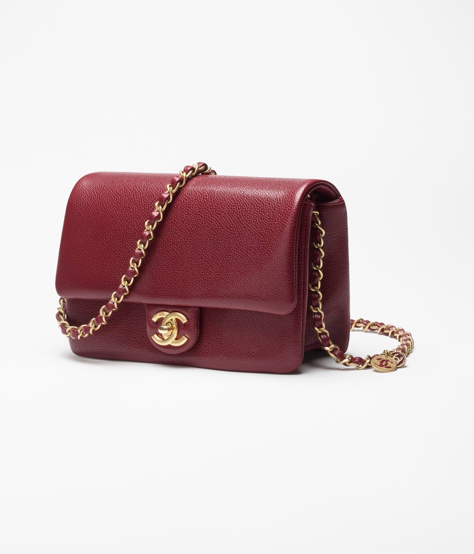 This Chanel Small Flap Bag is crafted in burgundy grained shiny calfskin with brushed gold hardware, front flap with CC turnlock closure, single interwoven brushed gold and black leather shoulder strap with two round CC coin charms.
