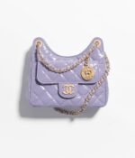 This Chanel Purple Quilted Shiny Crinkled Calfskin Small Hobo Bag features a front flap pocket with CC logo. Shiny crinkled calfskin feels exquisite and luxurious. Magnetic closure. One pocket on the back with magnetic closure. Dangling number 5 plaque. Distressed/antique gold-tone hardware. Lined in fabric. This bag is perfect for everyday use.