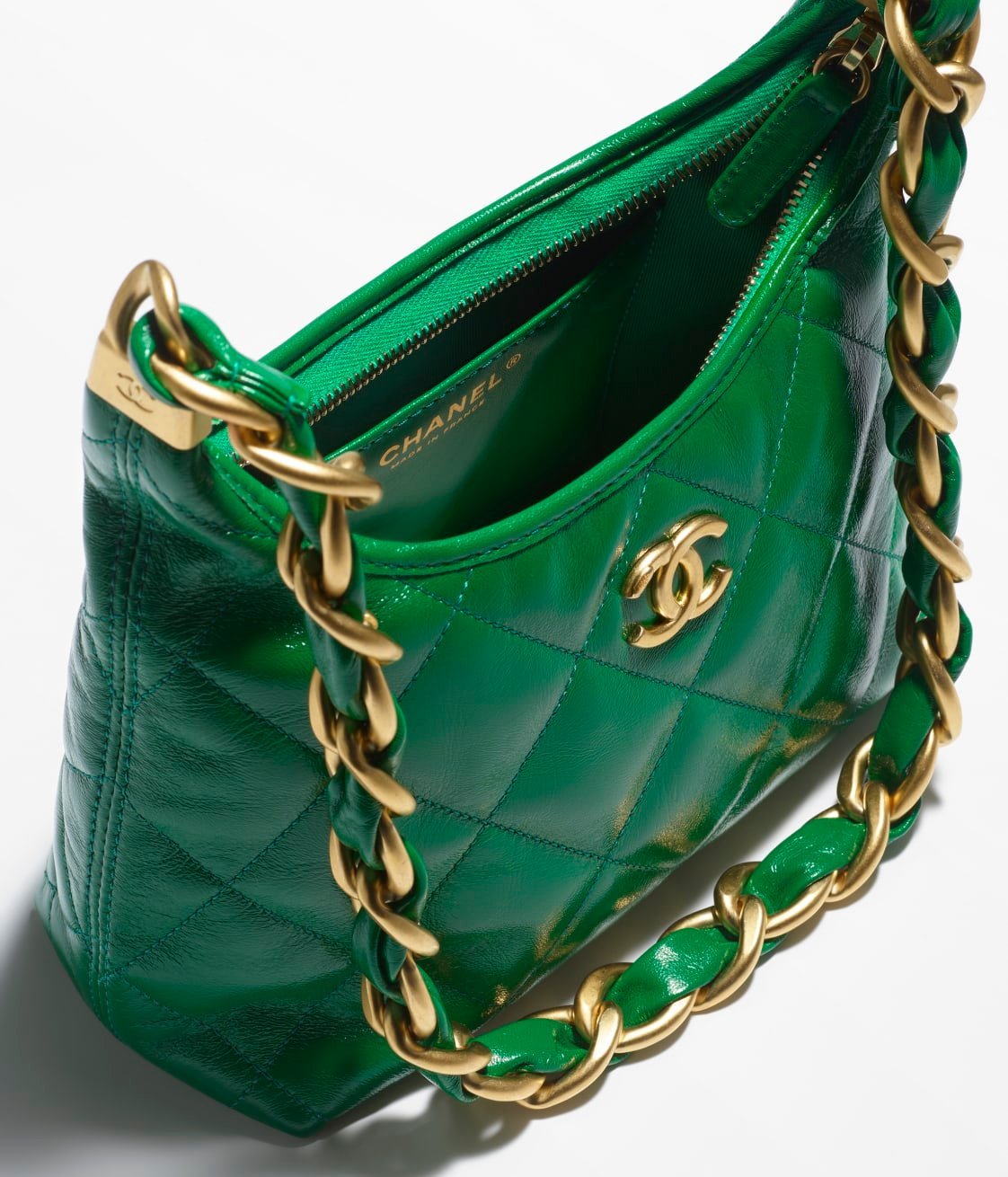 This Chanel Green Quilted Shiny Crinkled Calfskin Small Hobo Bag features CC logo, shiny crinkled calfskin leather with a beautiful luxurious feel, distressed/antique gold tone hardware. Lined in fabric. This bag is perfect for everyday use.