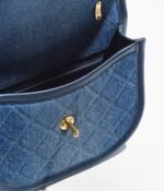 This small Chanel flap bag is crafted in blue denim with antique gold hardware, tone-on-tone stitching, front half-moon pocket with CC turnlock closure, antique gold chain and blue leather shoulder/crossbody strap.