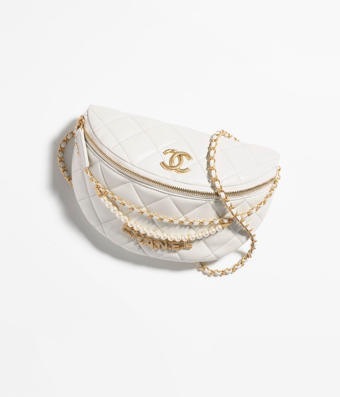 This small waist bag is made of white lambskin, imitation pearls and light gold hardware, with tonal stitching, imitation pearls and light gold hardware CC on the front, zip closure, zip pocket on the waist bag, light gold and metal interweaving, white leather chain link belt/crossbody strap.