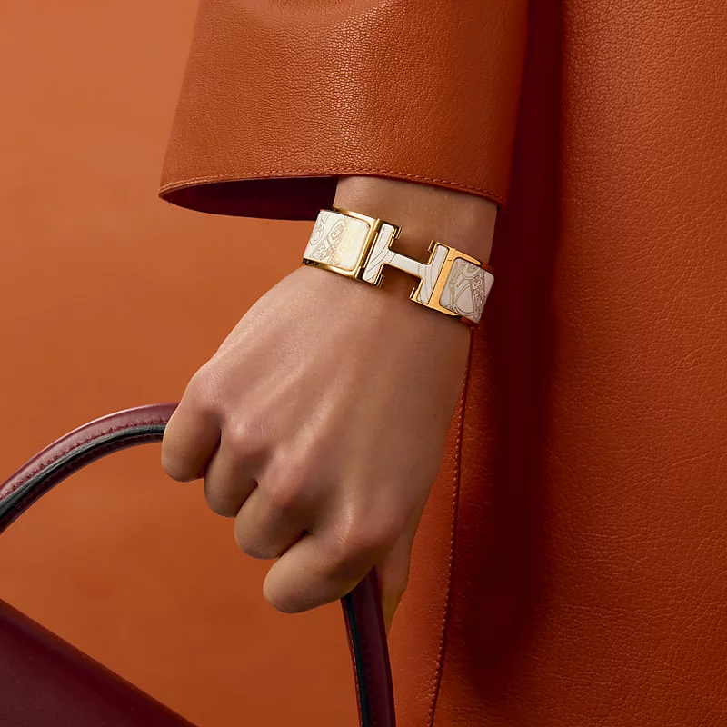 Wide bracelet in ‘Clic Clac H Brides de Gala Applique Pique’ printed enamel, design by Hugo Grygkar.