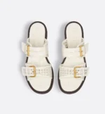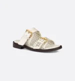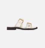 New for Cruise 2025, the D-Avenue slide is an urban and elegant creation. Crafted in white openwork Microcannage calfskin, it features two straps embellished with adjustable buckles and the gold-tone Christian Dior Paris signature on the upper strap. Completed by a comfortable padded Microcannage sole, the slide will lend a refined touch to any casual look.