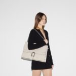 Gucci presents a maxi version of the signature Dionysus shoulder bag. Designed with a more contemporary look, this iteration in sleek light grey patent leather features a tiger head closure with a flap and a sliding chain that can be adjusted to wear with the preferred length and style.