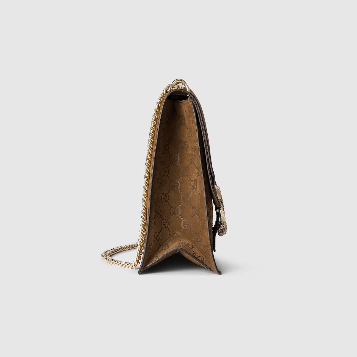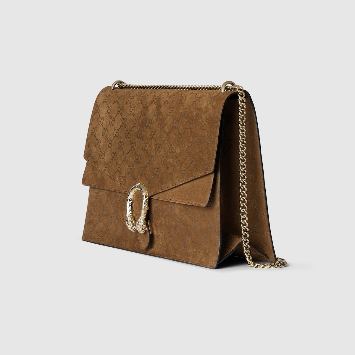 Gucci presents a large version of the signature Dionysus shoulder bag. Crafted from brown GG suede, this iteration features a tiger head closure with a flap and a sliding chain that can be adjusted to wear with the preferred length and style.