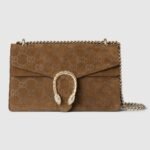 Gucci presents a small version of the signature Dionysus shoulder bag. Crafted from brown GG suede, this iteration features a tiger head closure with a flap and a sliding chain that can be adjusted to wear with the preferred length and style.