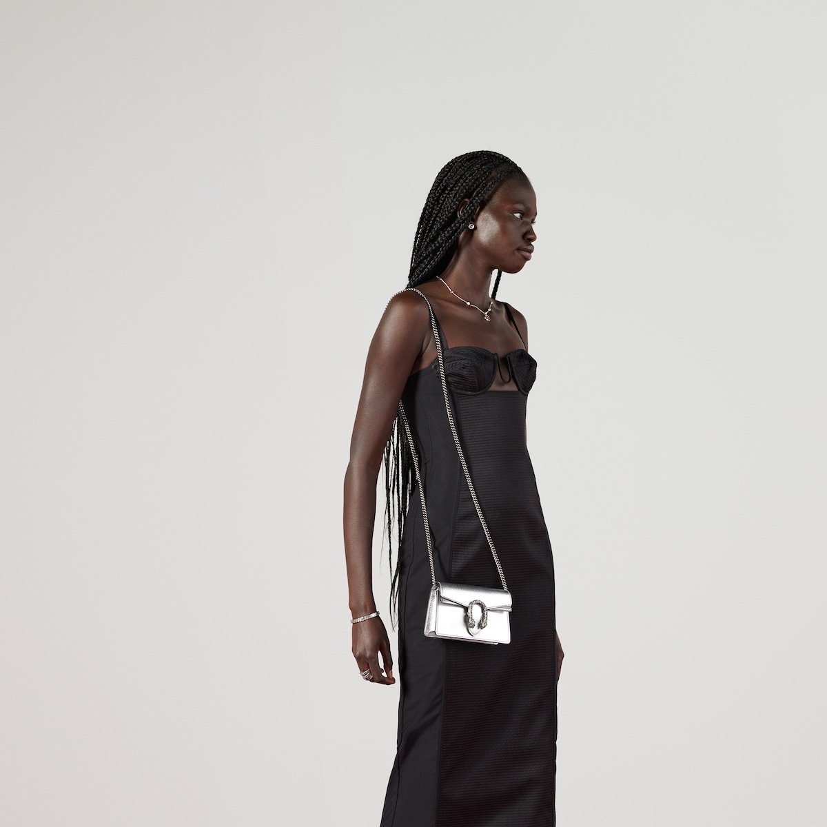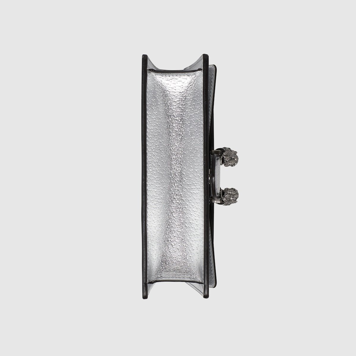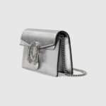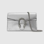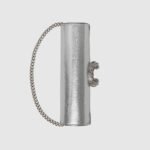 The structured super mini bag is introduced in metallic silver leather, with a key ring that can be used to attach the bag to a separate larger bag. The closure features the textured tiger head spur??the unique detail defines the line, referencing the Greek god Dionysus, who in myth is said to have crossed the river Tigris on a tiger sent to him by Zeus.