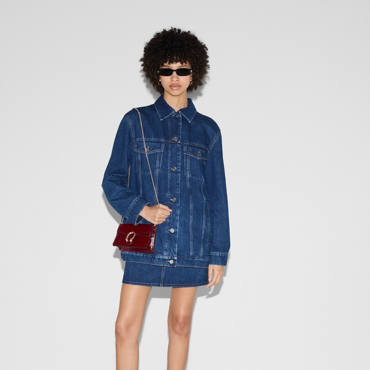 A shiny patent leather, in the signature Rosso Ancora shade of red, brings a fresh take to the Dionysus’ well-structured design, while creating contrast with the signature tiger head hardware in a light gold tone. A suede leather lining completes the style with an elegant finish.
