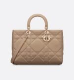 New for Summer 2024, the Lady D-Sire bag draws inspiration from the signature elegance of the Lady Dior design. Reimagined with a casual style for an urban look, the lightweight dark brandy grained Taurillon leather feels soft to the touch yet offers excellent durability. The large style is embellished with pale gold-finish metal D.I.O.R. charms highlighting the silhouette. Showcasing a removable, thin leather shoulder strap, the unique bag can be carried by hand or over the shoulder.